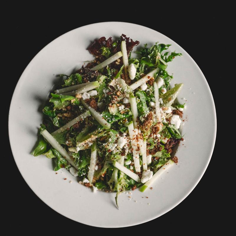 Leek ash goat cheese, tomatoes, pickled red onions, croutons, micro greens, olive oil.